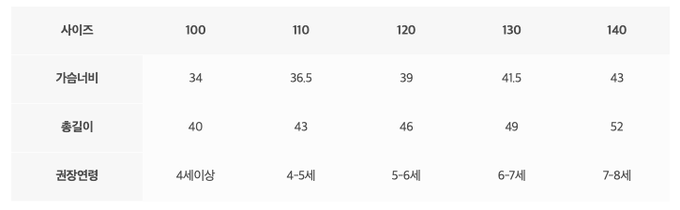 尺寸表由左而右為:尺寸、胸寬、總長、建議年齡