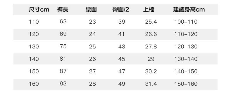 100cm、110cm、120cm、130cm、140cm、150cm、160cm
