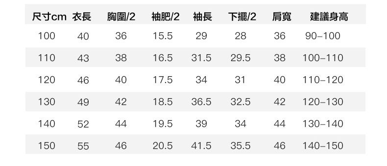 100cm、110cm、120cm、130cm、140cm、150cm、160cm