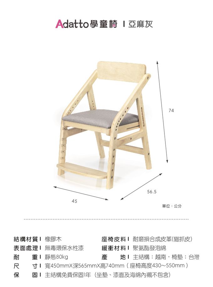 ADATTO學童椅(5歲/115cm以上適用)-亞麻灰 (寬450mm×深565mm×高740mm)