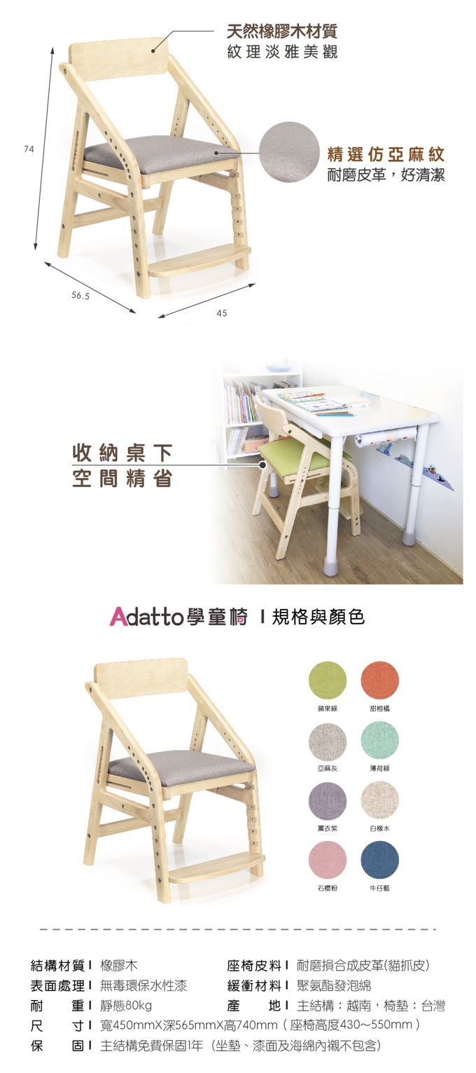 木質椅子質感好,雙腳能放踏板上,小孩坐得很舒服,也能調整坐姿。