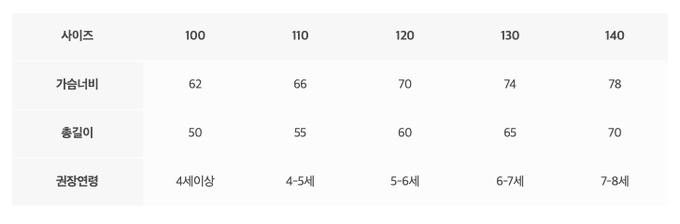 尺寸表由上而下為:尺寸、胸圍、總長、建議年齡