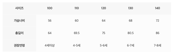 尺寸表由上而下為:尺寸、胸圍、總長、建議年齡