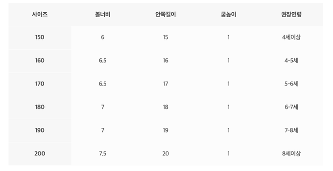 尺寸表由左至右為:尺寸、鞋寬、腳長、跟高、建議年齡