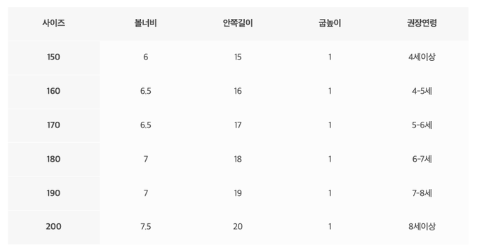 尺寸表由左至右為:尺寸、鞋寬、腳長、跟高、建議年齡