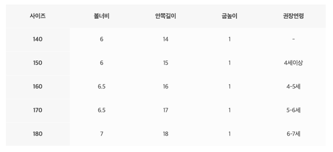 尺寸表由左至右為:尺寸、鞋寬、腳長、跟高、建議年齡