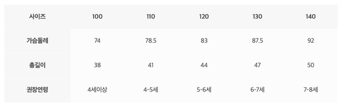 尺寸表由上而下為:尺寸、胸圍、總長、建議年齡