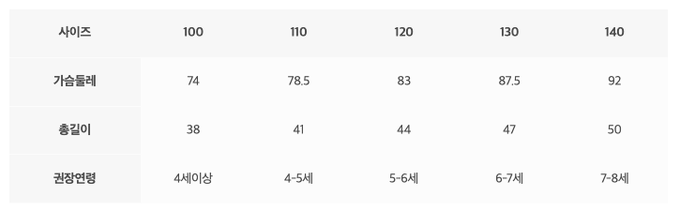 尺寸表由上而下為:尺寸、胸圍、總長、建議年齡