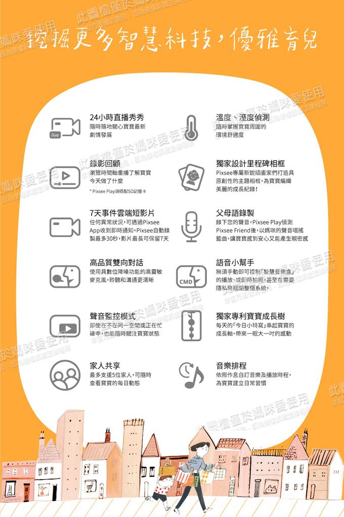 注意事項:商品鑑賞期非試用期,商品一經拆封,即有可能無法回復原狀,在不確定是否辦理退貨前,請勿拆封/使用。 Pixsee Friends商品一經拆封即無法退、換貨,在不確定是否辦理退貨前,請勿拆封/使用。 商品如經拆封、使用或拆解等以致缺乏完整性及失去再販售價值時,將影響退貨權益,並酌收整新費用。 保固期:於原廠授權之通路購買pixsee,正常使用情況且非人為因素下故障,享有自購買日起1年的保固 保固證明:電商-購買證明(訂單編號) 保固注意事項:保固範圍不含五合一成長支架、玩偶