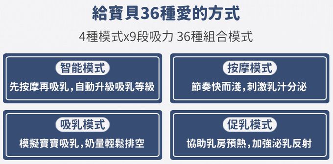 4種吸乳模式:智能自動、按摩、哺乳、促乳