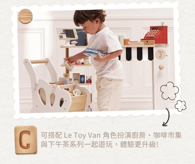 。可搭配 Le Toy Van 角色扮演廚房,咖啡市集與下午茶系列一起使用