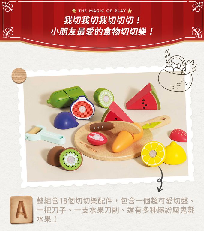 。整組含18個切切樂配件,包含一個超可愛切盤、一把刀子、一支水果刀削、還有多種繽紛魔鬼氈水果!