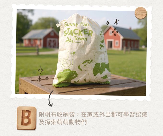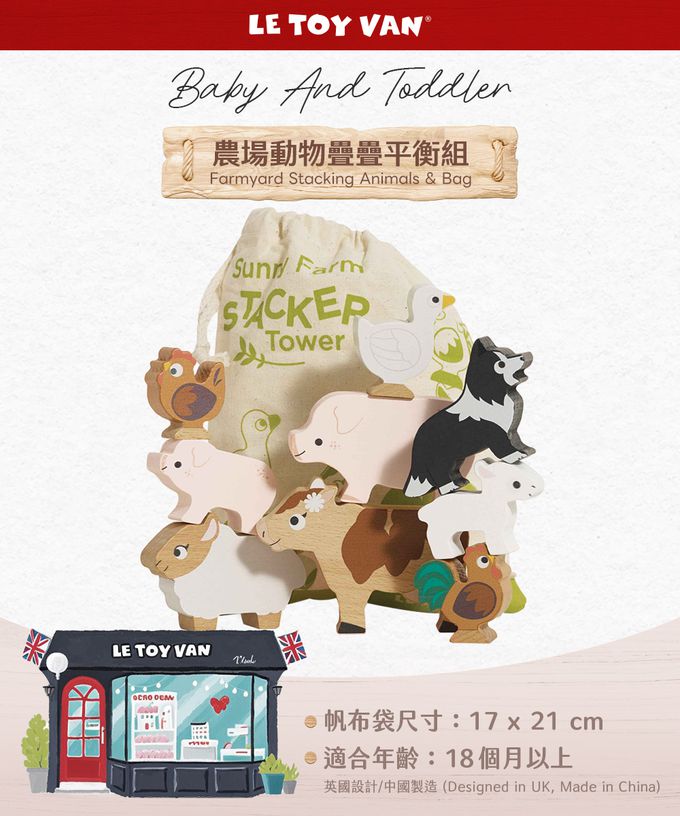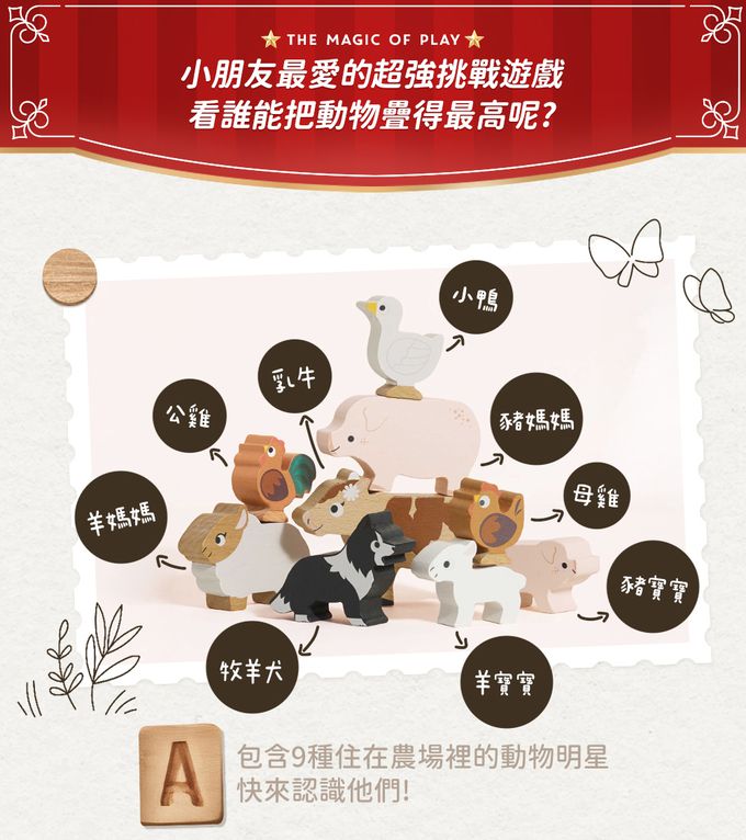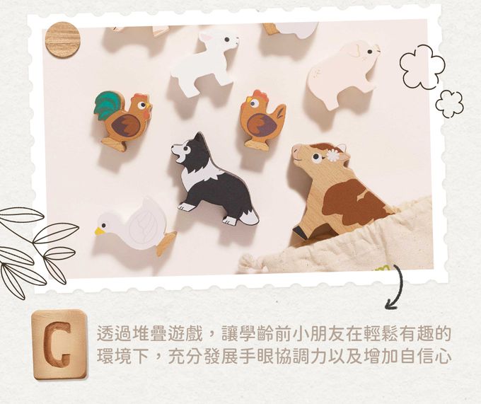。這組農場動物動物疊疊樂,包含了羊媽媽、羊寶寶、豬媽媽、豬寶寶、乳牛、小鴨、公雞、母雞 ,牧羊犬等