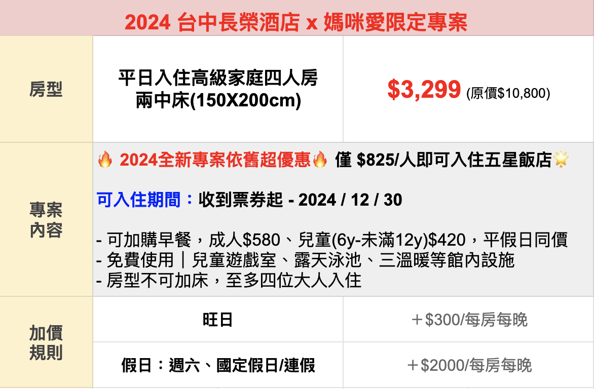 註 1:專案內容皆不含早餐,早餐可於現場加購(免收服務費),大人每位 $580、6歲-未滿12歲兒童 $420,平假日同價,如有變動以飯店官網為主。每房固定提供 4 份備品,如需現場加購備品一份 $300。