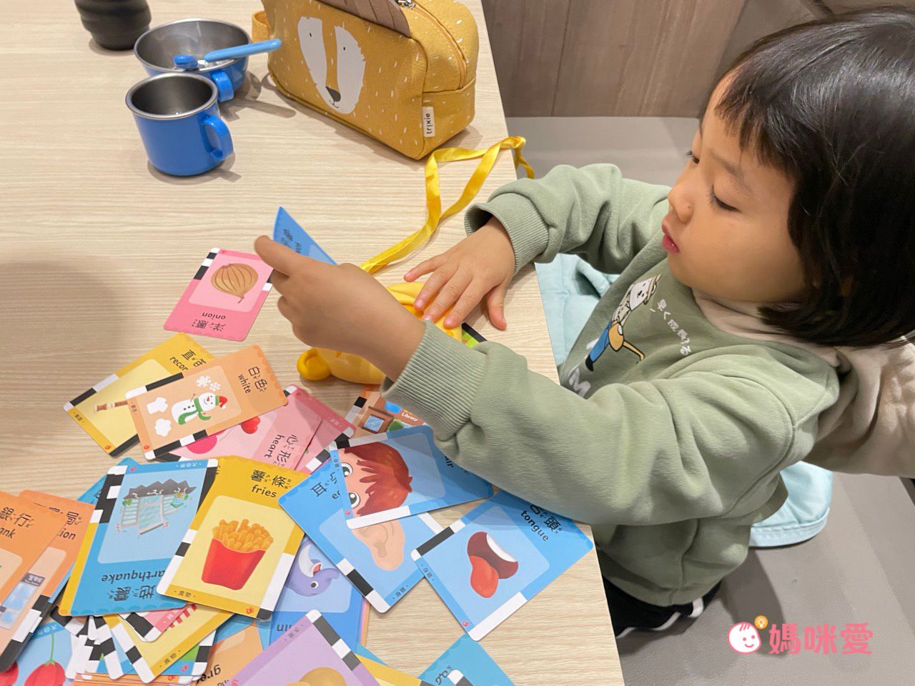 也因為卡片豐富、操作直觀,所以3歲多的柳橙能自己玩一個下午,過程中不太需要媽咪協助。但媽咪會喜歡在一旁看她挑了哪張卡片,像是挑到“牙齒”就會問柳橙:那牙齒在哪裡呢?柳橙就會用小手指著自己的牙齒。