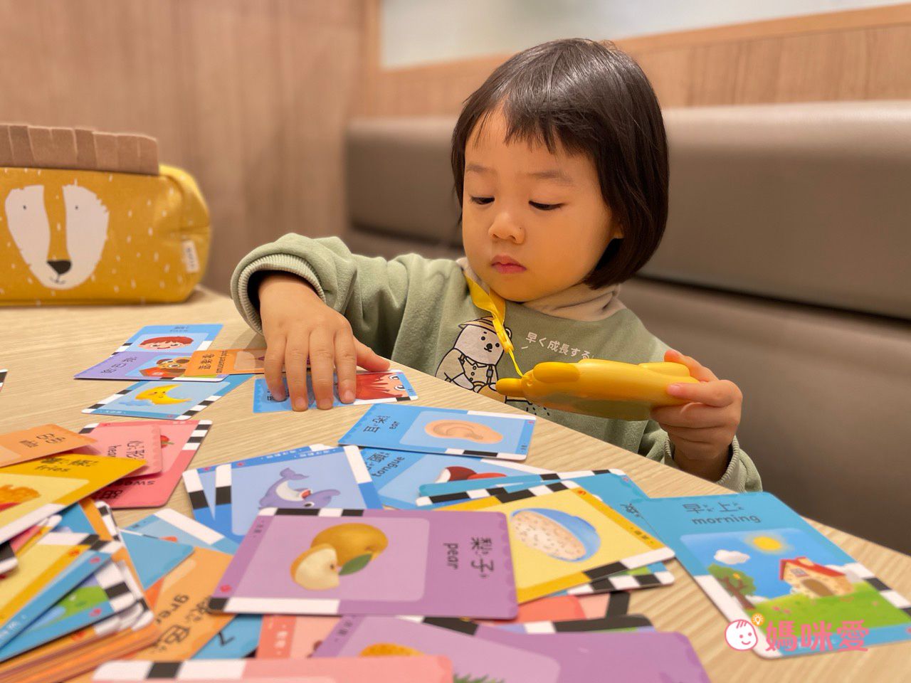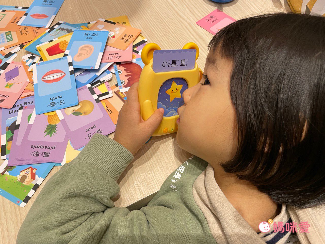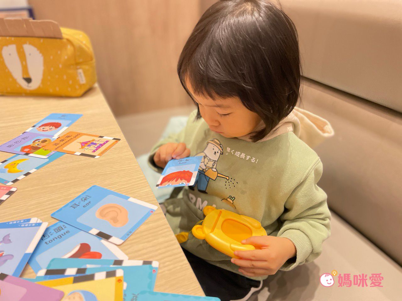 當很多小卡出現在眼前,柳橙就會迫不及待的每張都想要插進讀卡機中,聽聽頭髮的中文英文怎麼念⋯等等,搭配圖像記憶,印象也會非常深刻。