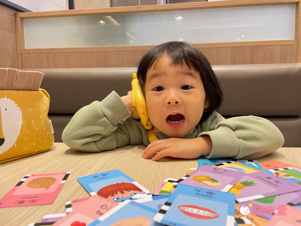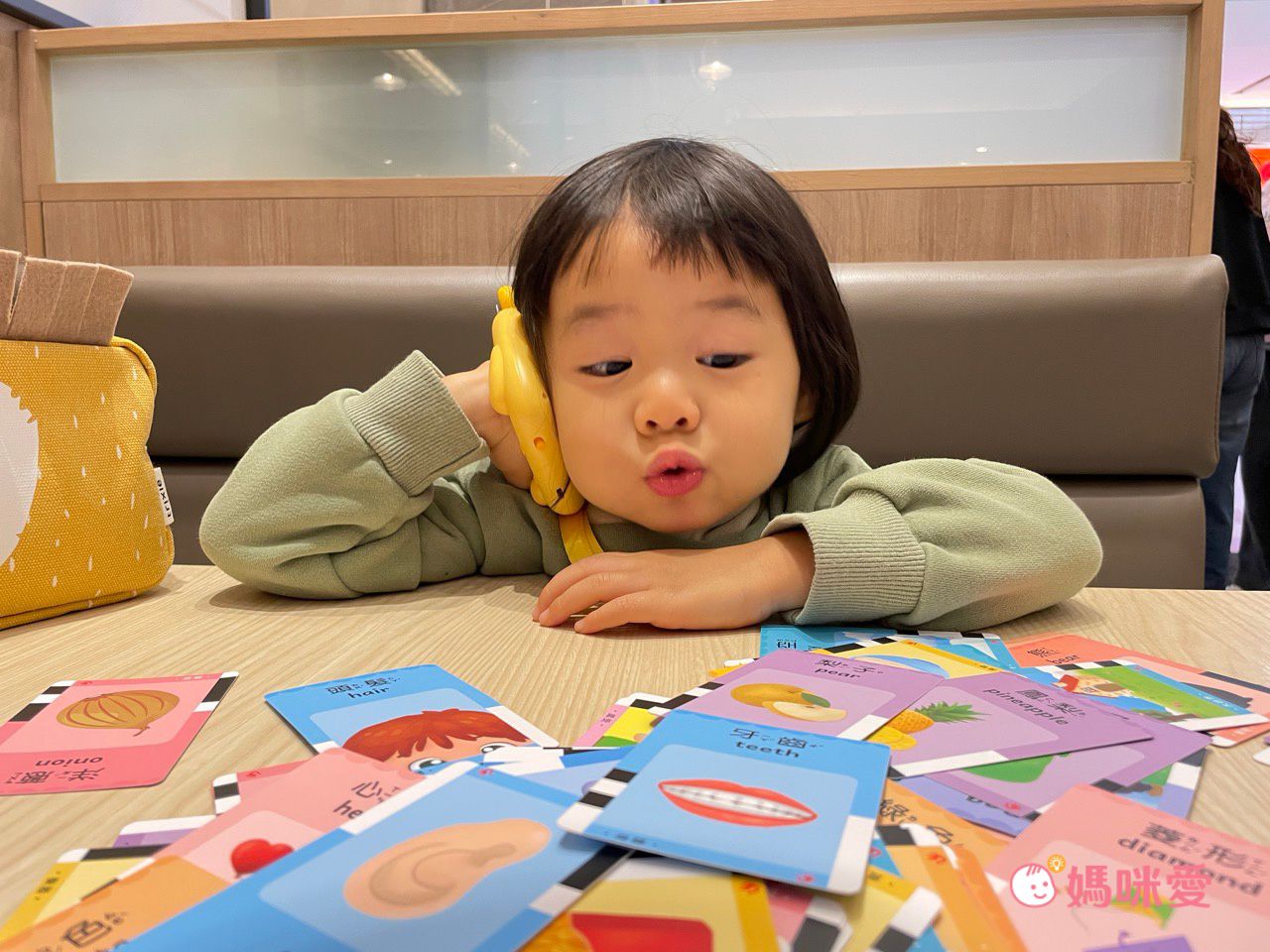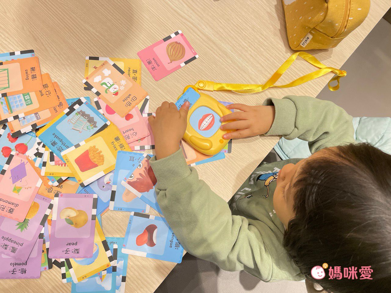 當很多小卡出現在眼前,柳橙就會迫不及待的每張都想要插進讀卡機中,聽聽頭髮的中文英文怎麼念⋯等等,搭配圖像記憶,印象也會非常深刻。