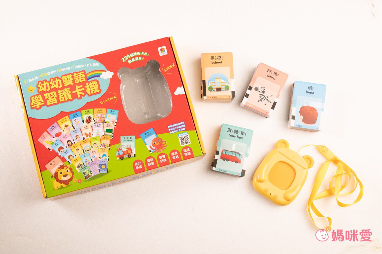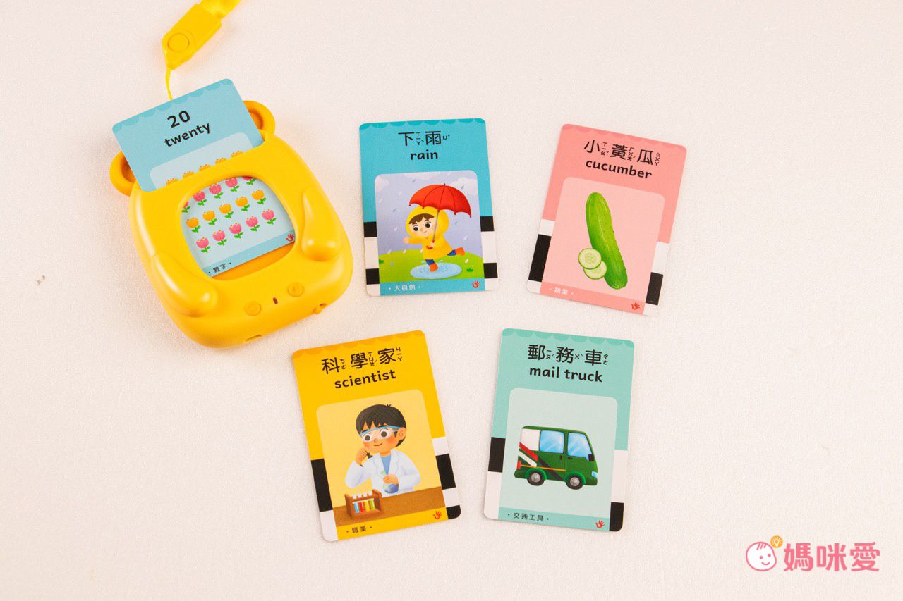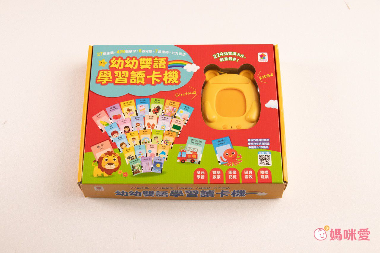 除了認識生活事物以外,還有426個中英文單字(含注音),豐富了孩子的學習過程。內容物則是有一臺可愛小熊讀卡機+4疊很厚的小卡片(共224張雙面圖卡)+吊繩+充電線。