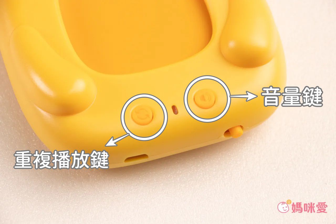 小熊讀卡機上有音量鍵:可多段式調整音量大小;重複播放鍵:不用反覆插卡,就能重複聆聽;在兩個按鍵中間的是電源燈:充電時會顯示紅燈,已開機會顯示藍燈,讀取卡片中會顯示綠燈。