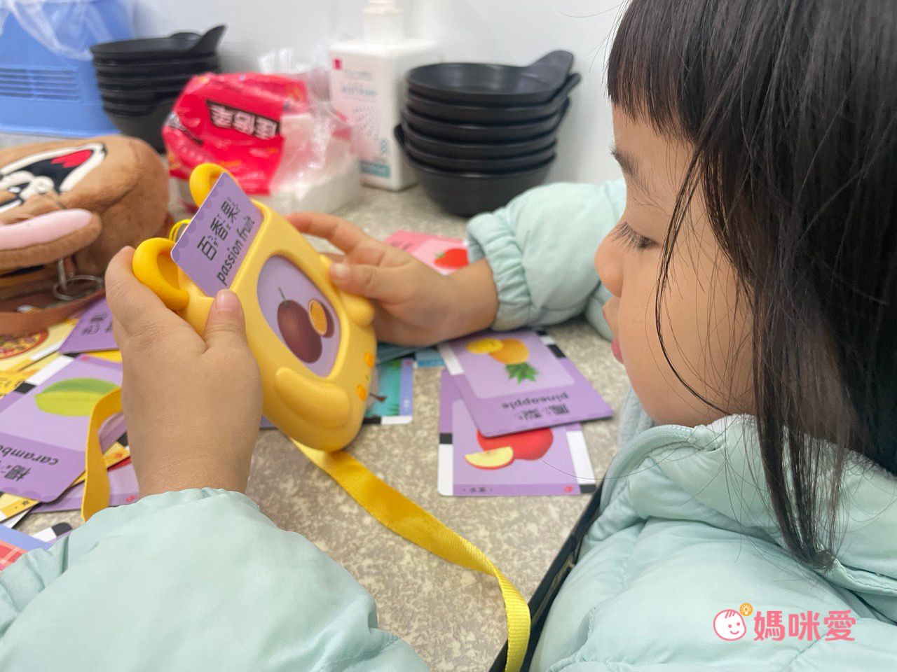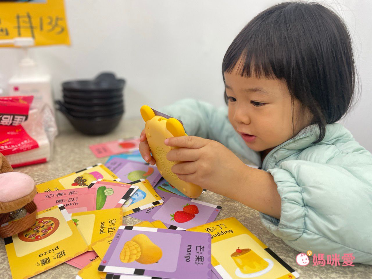 小卡的四角都是圓角邊,所以不會扎到小手,也很好抓握。仔細看還會發現有九九乘法的主題!表示讀卡機除了3歲多的柳橙適合學習,一直到學前班或開始要學習九九乘法的孩子們也都很適合哦~