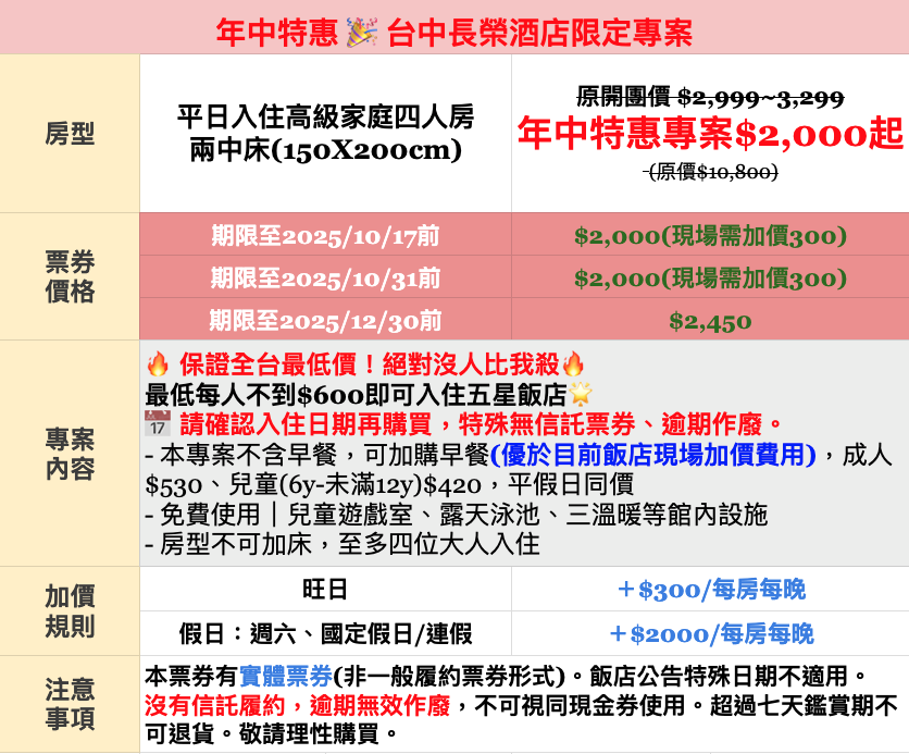 商品 1 🏨 可入住期間:收到票券起 - 2025/10/17 (原始專案價$2999,本次專案使用需現場加價300)