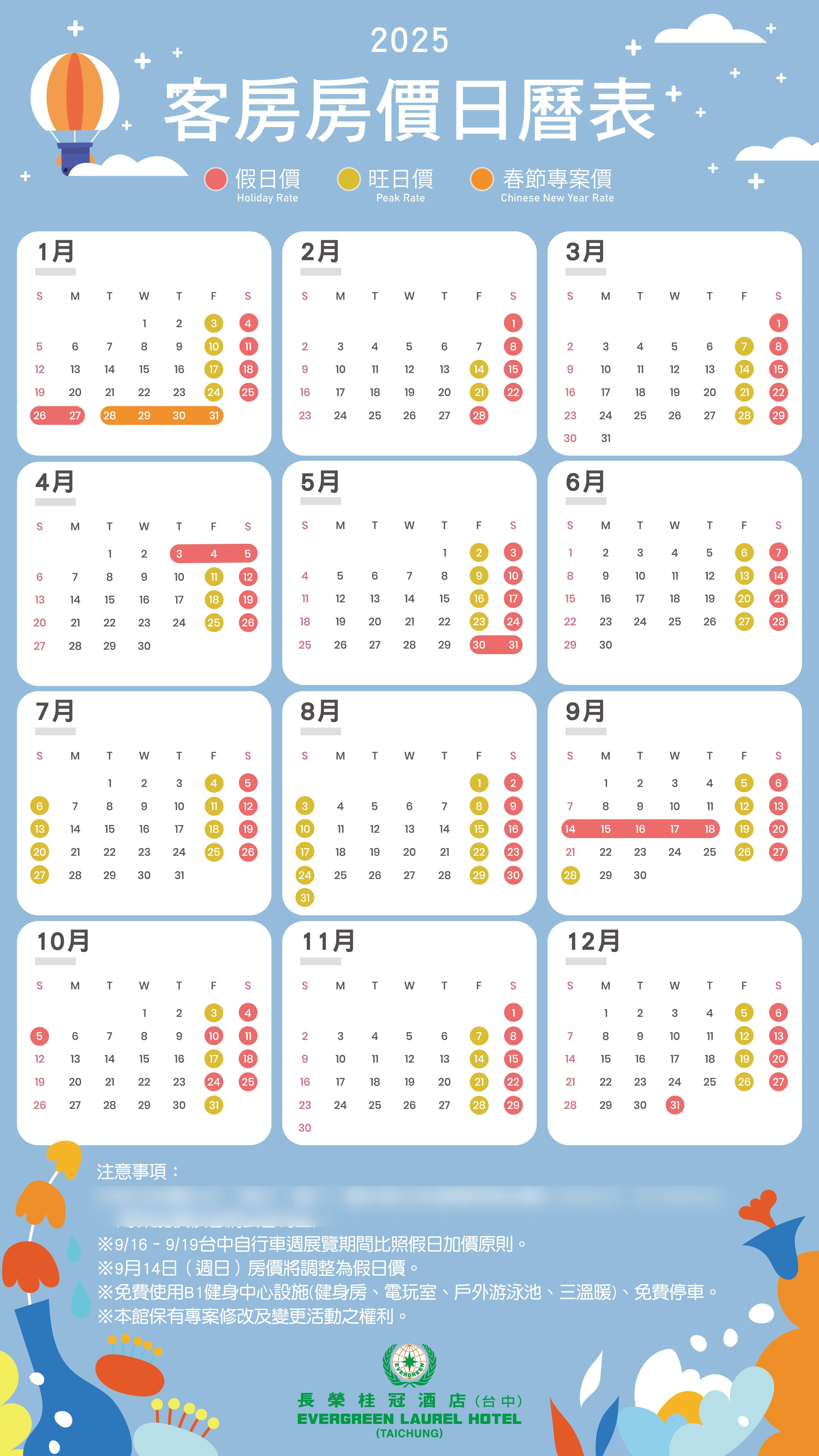 註 :平日:一般星期日~星期四、旺日:一般星期五(其餘旺日規定請參考飯店公告,飯店行事曆)、假日:星期六、國定假日/連假。飯店公告特殊日期不適用。(2026農曆春節期間不適用)