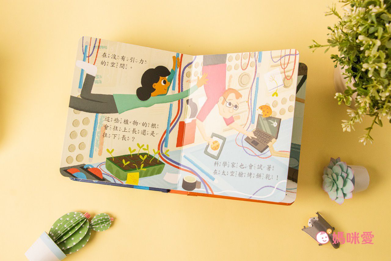 還有太空人搭乘火箭抵達上空會開始在沒有引力的空間下生活、工作。科學家也會試著在太空艙烤餅乾呦,請小朋友猜猜看,在太空艙裡的植物會往上長還是往下長呢?