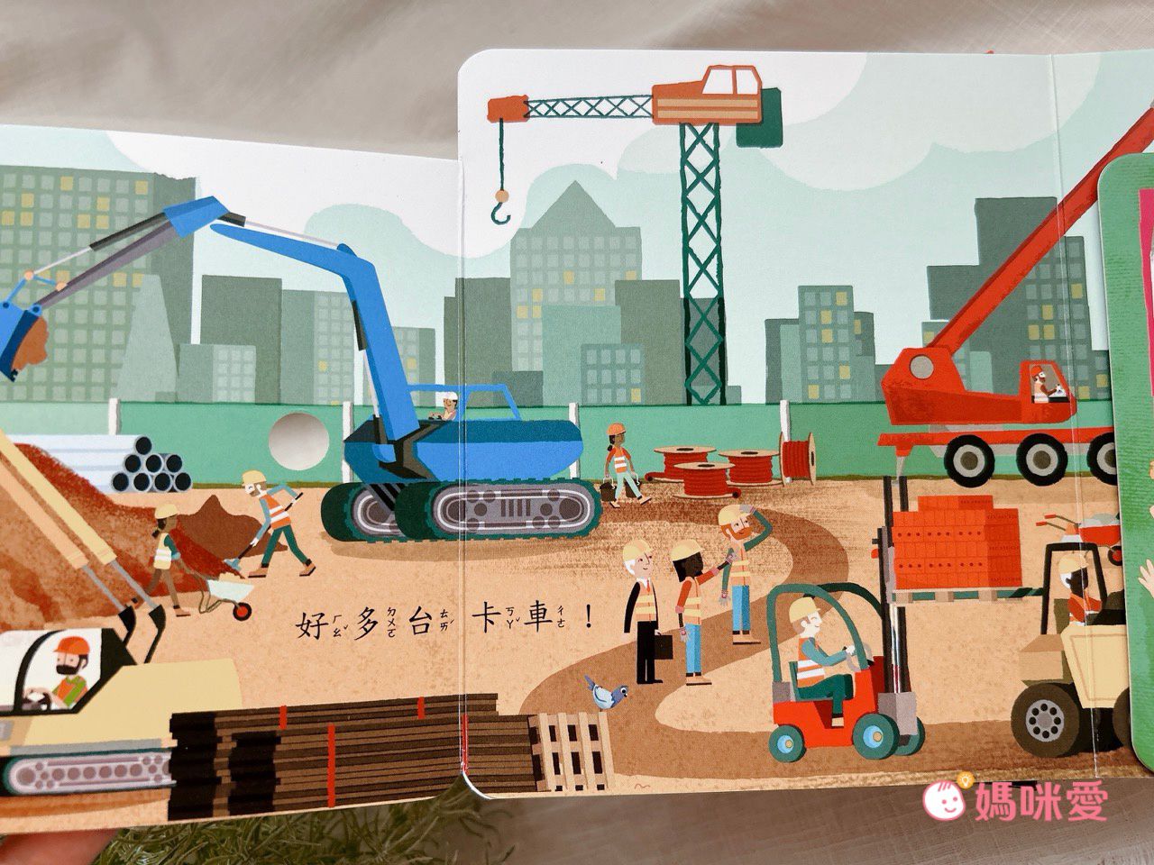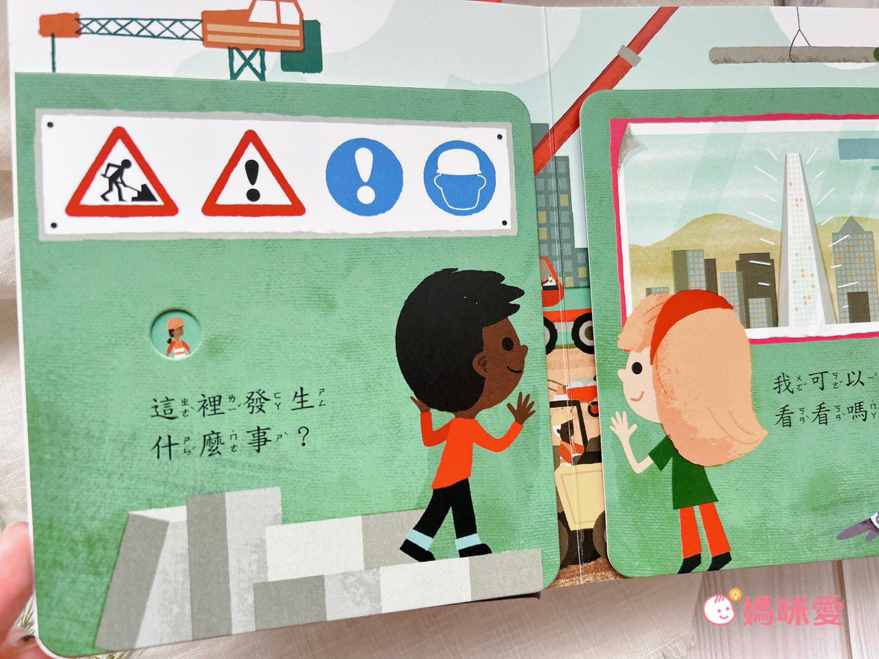 『媽咪~工人是怎麼把地板挖一個洞的呀?』王紅看書的過程時不時會提出問題,非常好奇的想知道一棟棟大房子是怎麼變出來的