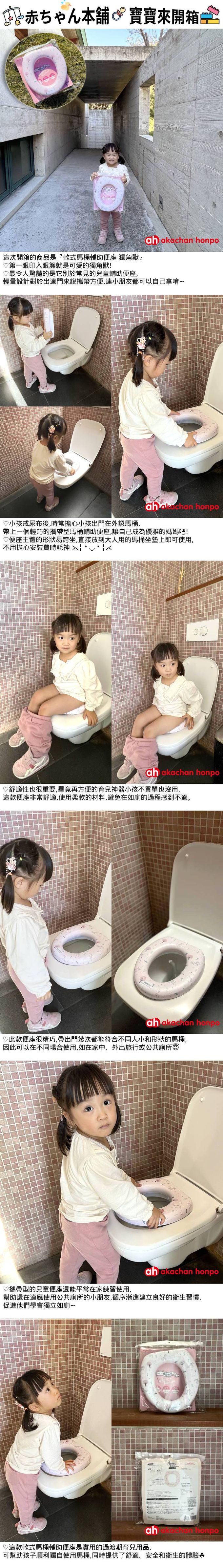 • 注意事項:●請勿作為其他用途使用。●幼童在使用時請家長務必多加注意。●請勿存放於陽光直射處。●請勿在火源旁使用。以免跌倒等時發生燙傷或火災的危險。●請確認前後的位置,將馬桶輔助便座確實套入大人用的西式馬桶坐墊後再使用。以免在使用時鬆脫而導致跌倒或受傷。●請由家長協助上下馬桶輔助便座。●另外,即使幼童已可自行使用腳踏台上下馬桶輔助便座,家長或大人依然得在旁監視。●大人用西式馬桶坐墊會因種類的不同而與馬桶輔助便座之間產生縫隙。請注意避免夾到幼童的手指而導致受傷。