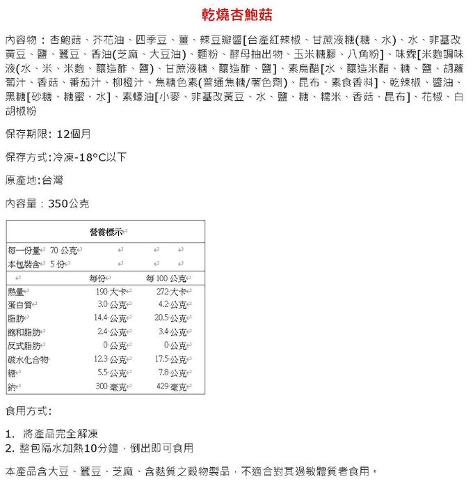 • 成分:*黃金素佛跳牆 內容物:蔬菜高湯[水、蘋果、白蘿蔔、高麗菜、玉米、紅蘿蔔、昆布]、芋頭、筍干[竹筍、鹽、水]、栗子、猴頭菇、素火腿[非基因改造大豆分離蛋白及大豆纖維、小麥蛋白、大豆油、糖、鹽、馬鈴薯澱粉、天然素食香料、酵母抽出物、紅麴粉]、杏鮑菇、鳳眼果[鳳眼果、大豆油]、洋菇、蓮子、竹腸[小麥蛋白、高筋麵粉、玉米澱粉]、素蠔油[小麥、非基改黃豆、水、鹽、糖、糯米、香菇、昆布]、北蟲草、乾香菇、紅棗、碘鹽、香油[大豆油、芝麻油]、白胡椒粉、五香粉[小茴香、肉桂、大茴香、丁香、花椒] *紅燒四喜烤麩 內容物:桂竹筍[竹筍、水、檸檬酸]、水、烤麩[水、麵粉]、大豆油、紅蘿蔔、醬油露[水、黑豆、黃豆、小麥、糖、味噌、甘草、酵母抽出物]、醬油[水、非基改黃豆(高蛋白豆片)、小麥、食鹽]、糖、素蠔油[小麥、非基改黃豆、水、鹽、糖、糯米、香菇、昆布]、香菇、薑、香油[大豆油、芝麻油] *焗烤奶油金瓜 內容物 :馬鈴薯、南瓜、杏鮑菇、水、青花椰、乳酪絲[殺菌牛奶、乳酸菌、凝乳酵素(植物性)、氯化鈣、鹽、馬鈴薯澱粉]、大豆油、紅椒、椰奶[椰子萃取物、水]、鮮奶、奶油[殺菌乳脂]、蘑菇、麵粉、奶粉、糖、碘鹽、蔬菜風味調味料[乳糖、食鹽(食鹽、碘酸鉀)、酵母抽出物(酵母抽出物、麥芽糊精)、綠花椰菜粉、南瓜粉、大白菜粉、白蘿蔔粉、紅蘿蔔粉、香菇粉]、義大利香料[迷迭香、月桂葉、大紅椒、黑胡椒、芫荽、鹽、百里香、糖、綠荳蔻、辣椒、洋芫荽 乾燒杏鮑菇 內容物 : 杏鮑菇、芥花油、四季豆、薑、辣豆瓣醬[台產紅辣椒、甘蔗液糖(糖、水)、水、非基改黃豆、鹽、蠶豆、香油(芝麻、大豆油)、麵粉、酵母抽出物、玉米糖膠、八角粉]、味霖[米麴調味液(水、米、米麴、釀造酢、鹽)、甘蔗液糖、釀造酢、鹽]、素烏醋[水、釀造米醋、糖、鹽、胡蘿蔔汁、香菇、番茄汁、柳橙汁、焦糖色素(普通焦糖/著色劑)、昆布、素食香料]、乾辣椒、醬油、黑糖[砂糖、糖蜜、水]、素蠔油[小麥、非基改黃豆、水、鹽、糖、糯米、香菇、昆布]、花椒、白胡椒粉*素八寶油飯 *素八寶油飯 內容物 :長糯米、水、芋頭、大豆油、花生、毛豆、白果[去芯白果仁、檸檬酸]、香椿醬[香椿、大豆沙拉油、鹽]、香油[大豆油、芝麻油]、醬油[水、非基改改造黃豆(高蛋白豆片)、小麥、食鹽]、蓮子、糖、素皮絲[小麥麵筋、大豆沙拉油]、薑、松子、香菇、碘鹽、白胡椒粉 *桂花八寶芋泥 內容物 :芋頭、水、桂花釀[桂花、冰糖、麥芽]、鮮奶油[乳脂、鹿角菜膠]、糖、栗子、黑糯米、紅豆、蓮子、蔓越莓果乾[蔓越莓、糖、葵花油]、大豆油、核桃、綠豆、南瓜籽