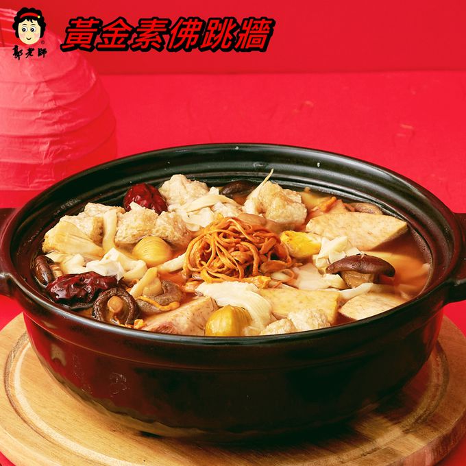 黃金素佛跳牆:湯頭以昆布、蘋果、紅蘿蔔、甜玉米、白蘿蔔等多種新鮮天然食材熬製的昆布蔬菜高湯為基底,加入素海參、素黃金魚翅,並且選用猴頭菇、台灣履歷香菇、杏鮑菇等多種菇類,最後加上黃金蟲草,增添佛跳牆自然豐富的天然香氣。
