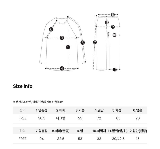上衣尺寸表由左而右為:總長、肩寬、胸寬、下擺長、袖長、袖寬(單位為公分)下著尺寸表由左而右為:總長、腰寬、臀寬、大腿寬、襠長(前/後)、下擺長(單位為公分)