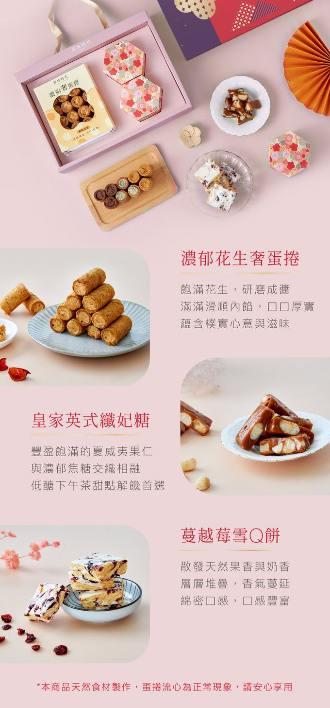 成分:*濃郁花生蛋捲:雞蛋、日本昭和麵粉、安佳奶油、椰糖、顆粒花生醬、杏仁粉、海藻糖、糖/皇家英式纎妃糖(內含5顆) 成分:夏威夷堅果、動物鮮奶油、寒天、赤藻糖醇、異麥芽寡糖、奶油/ 蔓越莓雪Q餅(內含3顆) 成分:祈福餅乾、麥芽糖、安佳奶油、奶粉、蛋白、蔓越莓、糖、海藻糖、寒天