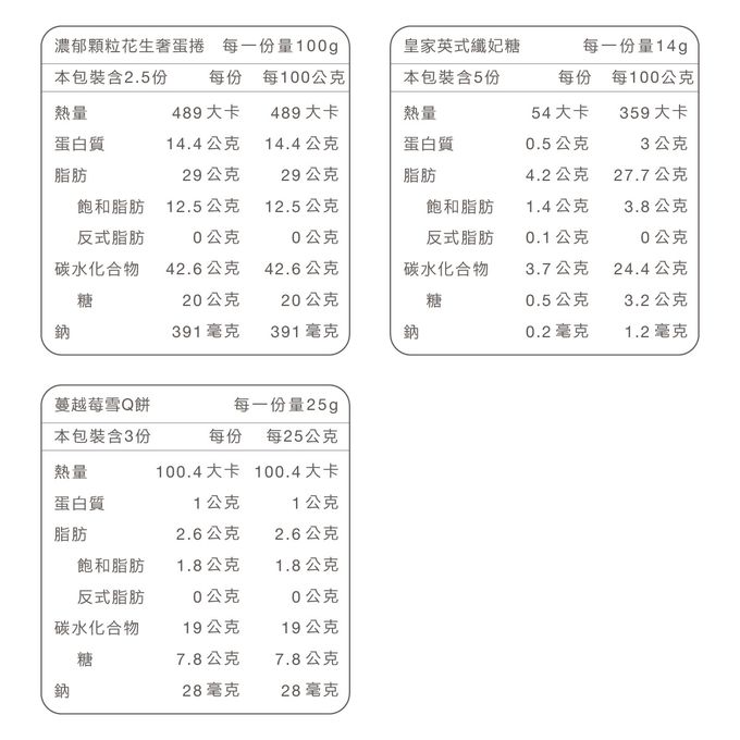 過敏原:蛋捲:本產品含奶、蛋、堅果、花生等麩質穀物類其製品,不適合對其過敏體質者食用/皇家英式纎妃糖 過敏原資訊:本產品含奶、堅果等製品,不適合過敏體質食用 / 蔓越莓雪Q餅:過敏原資訊:本產品含奶、堅果等製品,不適合過敏體質食用