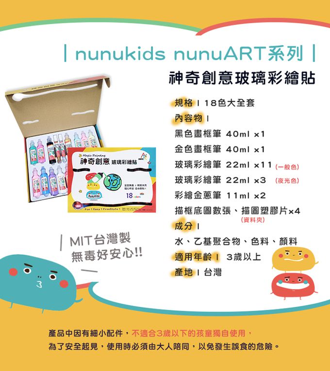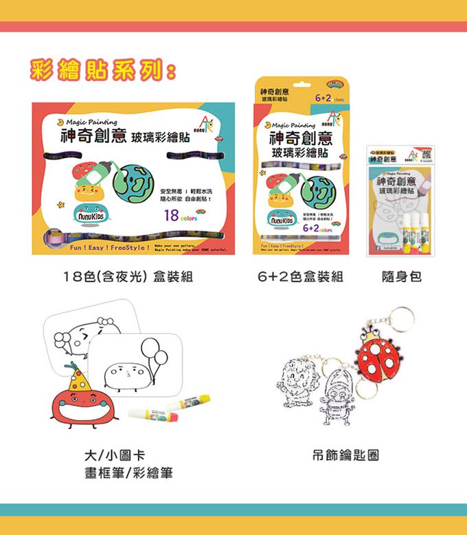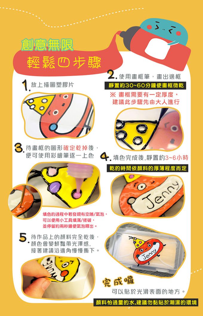 ◆ 自己動手做,親子快樂布置彩色環境◆ 在繪畫世界中激發寶貝無限創造想像力◆ 將創作變化成立體貼,訓練寶貝手部肌力及專注力◆ 通過美國及歐洲無毒安全標準,適用3歲以上寶貝◆ 待作品完全乾後可貼於任何具有平滑表面的物品上◆ 作品貼黏請避開潮濕環境
