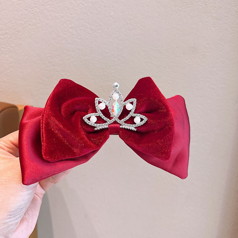 雙層絲絨皇冠蝴蝶結髮夾-紅色