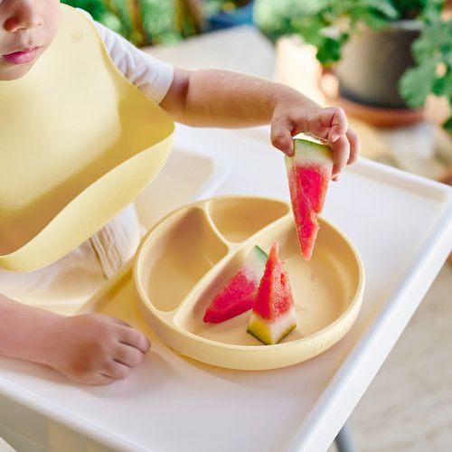 圓形吸盤面積適合大部分的餐桌 真的滿吸的 平面讓寶寶看到食物全貌 知道自己在舀什麼 分隔可以乾濕甜鹹分離很棒