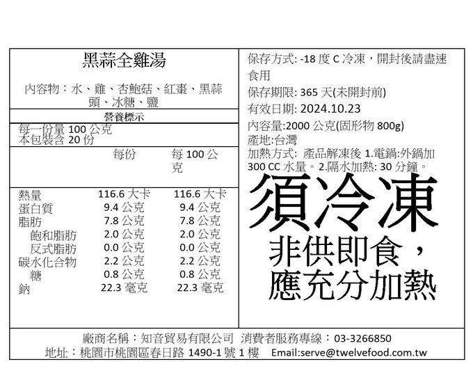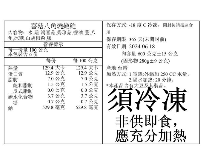 過敏原:1. 黑松露油飯:本產品含有大豆、堅果類*蛹蟲草不建議嬰幼兒、兒童、孕婦與真菌過敏者使用。 2. 紅酒燉羊膝:本產品含大豆其製品。 3. 京都排骨:本產品含有麩質之穀物及其製品,不適合對其過敏體質者食用。*肝腎功能不全病人及孕婦慎用。 4. 醬燒枝竹什錦蔬:本產品含大豆及麩質之穀物其製品。 5. 香辣牛三寶:本產品含大豆*胃炎病人及孕婦慎用。 6. 黑松露彩虹珍菌:本產品含大豆及其製品。 7. 黑蒜全雞湯 8. 鴻喜菇角燒嫩雞:本產品含大豆及其製品。 9. 芋頭西米露:本產品含有牛奶類、堅果類及其製品、大豆類及其製品,不適合對其過敏體質者食用。
