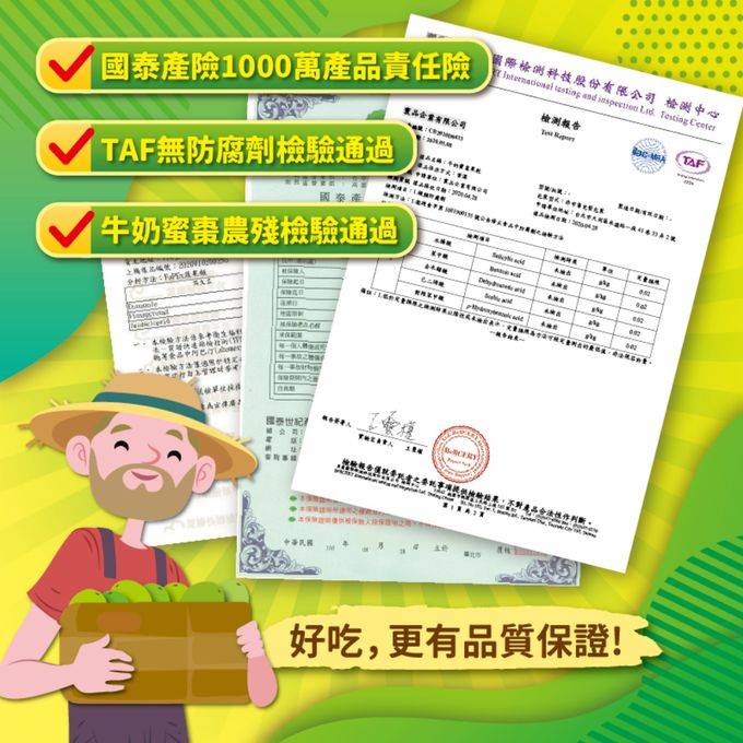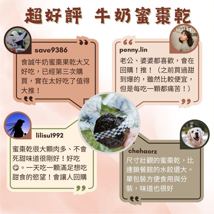 ♥ 遵循古法,24小時費工蜜煉製作♥ 果肉厚實軟硬適中,Q軟糯口,不黏牙不費牙 ♥ 保留蜜棗滋味,微甜不膩,回甘潤口 ♥ 富含蜜棗營養與膳食纖維,全家大小都可以安心享用的南台灣牛奶蜜棗果乾 ♥ TAF實驗室防腐劑零檢出、國泰1000萬產品責任險
