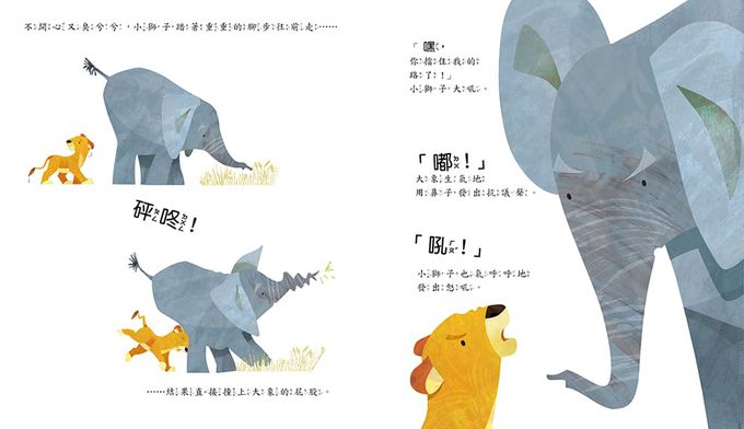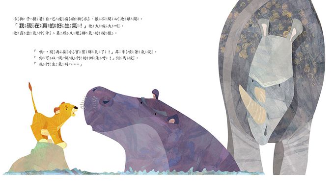 書裡的小獅子,因為和妹妹起了爭執被爸爸責備,所以十分生氣。面對自己的憤怒情緒,小獅子先是肆意地狂怒發洩,不僅傷害自己的身體,讓自己整個人都變得很不舒服,還和大象起了衝突,也嚇壞了其他動物朋友。但是他發現,這些行為似乎對排解憤怒情緒一點都沒有用……小獅子既挫折又苦惱,幸好最後有智慧的狒狒先生,教會了他和憤怒大象,如何用一些聰明的小方法來讓自己冷靜下來,變得心平氣和,最後和妹妹友愛地和解。
