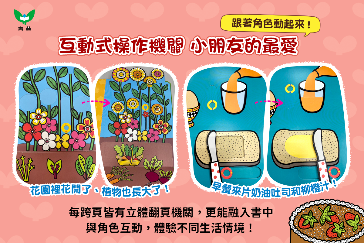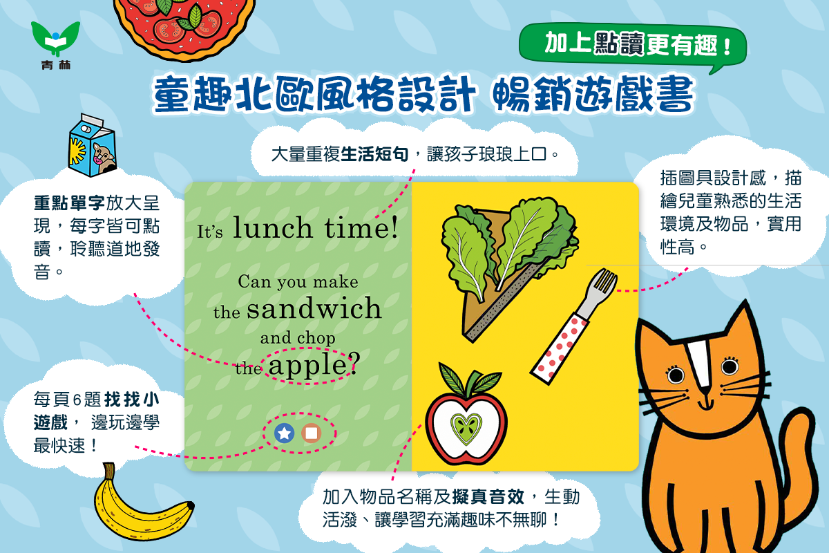 『午餐時間到了!你會做三明治和切蘋果嗎?』透過簡單問句去吸引孩子動動手操作三明治、切蘋果,操作過程中同時點讀學英文,與書本互動大幅提升。