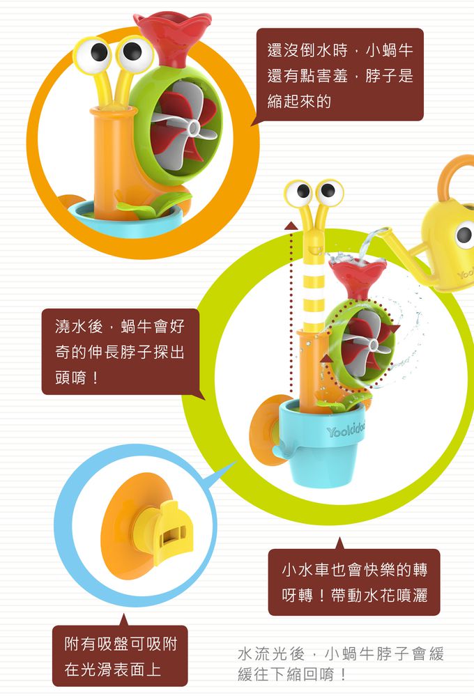 將可愛的澆水壺裝滿水後,往小蝸牛身上的小花澆水,蝸牛就會動起來呦!