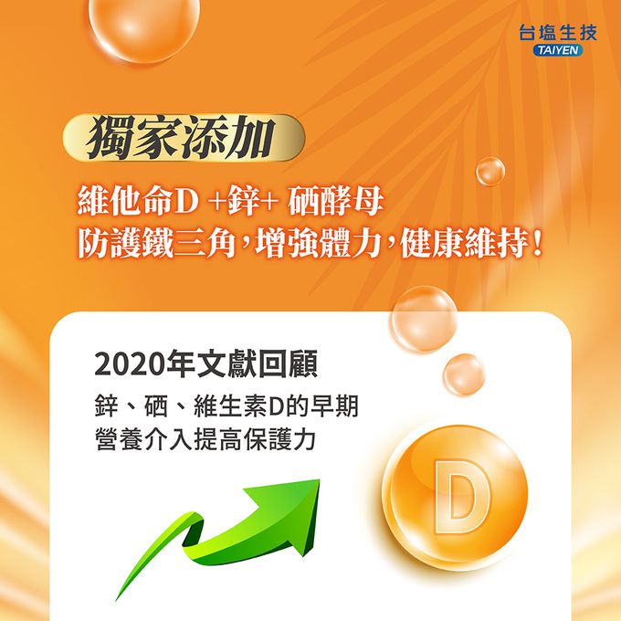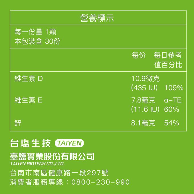 成分:玉米澱粉、膠囊(明膠、純水、二氧化鈦、硫酸月桂酯鈉、甘油、食用黃色五號、食用黃色四號)、葡萄糖酸鋅、維生素E(維生素E、辛烯基丁二酸鈉澱粉、二氧化矽)、硒酵母、維生素D3(辛烯基丁二酸鈉澱粉、蔗糖、L-抗壞血酸鈉(抗氧化劑)、中鏈三酸甘油酯、二氧化矽、維生素E(抗氧化劑)、維生素D3)、硬脂酸鎂、二氧化矽