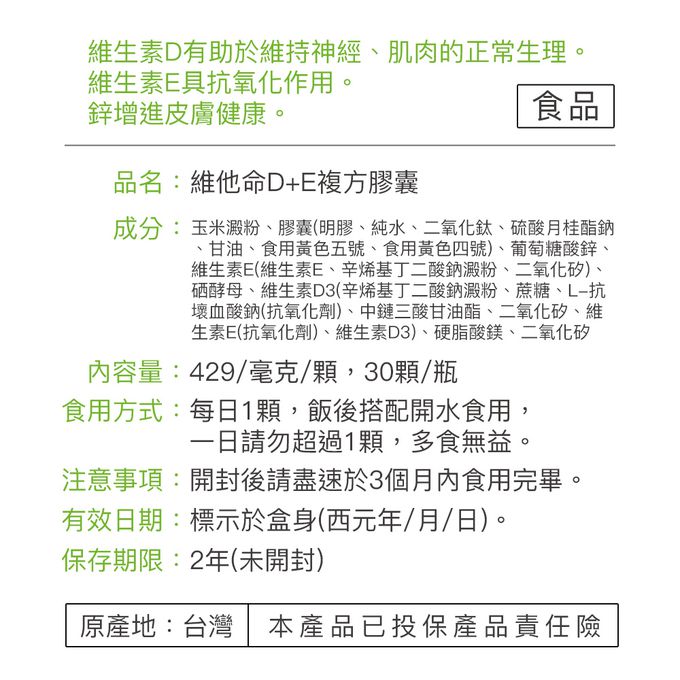 品名:維他命D+E複方膠囊(30錠x10罐,共300錠)