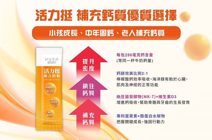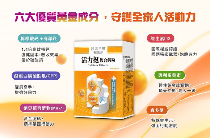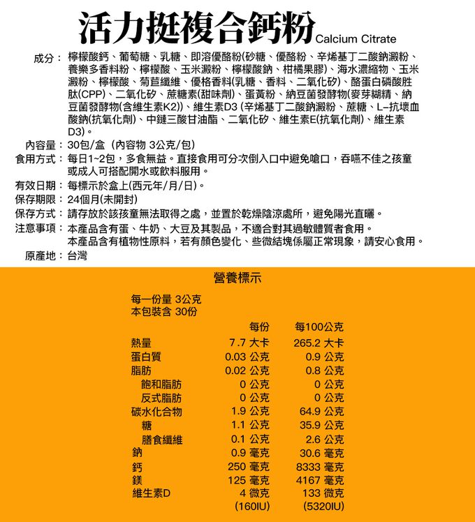 成分:檸檬酸鈣、葡萄糖、乳糖、即溶優酪粉(砂糖、優酪粉、辛烯基丁二酸鈉澱粉、養樂多香料粉、檸檬酸、玉米澱粉、檸檬酸鈉、柑橘果膠)、海水濃縮物、玉米澱粉、檸檬酸、菊苣纖維、優格香料(乳糖、香料、二氧化矽)、酪蛋白磷酸胜肽(CPP)、二氧化矽、蔗糖素(甜味劑)、蛋黃粉、納豆菌發酵物(麥芽糊精、納豆菌發酵物(含維生素K2))、維生素D3 (辛烯基丁二酸鈉澱粉、蔗糖、L-抗壞血酸鈉(抗氧化劑)、中鏈三酸甘油酯、二氧化矽、維生素E(抗氧化劑)、維生素D3)。