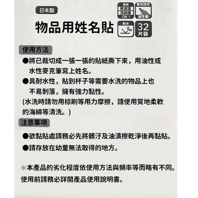 使用方式:●寫上姓名後貼到杯子、餐具等上面即可。●將已裁切成一張一張的貼紙撕下來,用油性或水性麥克筆寫上姓名。●具耐水性,貼到杯子等需要水洗的物品上也不易剝落,能黏很牢。