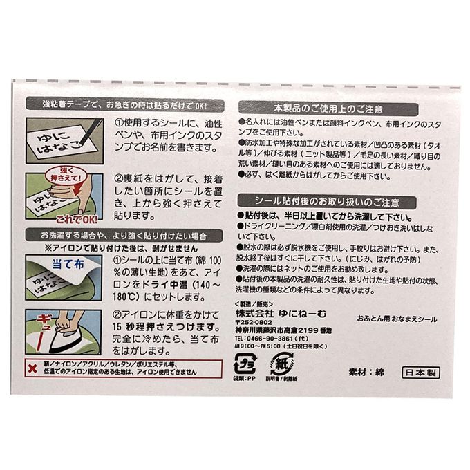 使用方式:①請用油性筆或布製品用印章在姓名貼上書寫姓名或文字。②從離型紙上撕下貼紙,放置在欲黏貼之處,從上方用手指用力壓按即可。③若欲洗滌該布製品時,請在已黏貼的貼紙上方墊一塊布,用中溫(140~180℃)乾熨燙。④將熨斗往下重壓約15秒左右。待完全冷卻後移開墊布。●絲質・尼龍・亞克力纖維・聚胺基甲酸酯・聚酯纖維等只能使用低溫熨燙的布料不可使用熨燙方式黏貼。