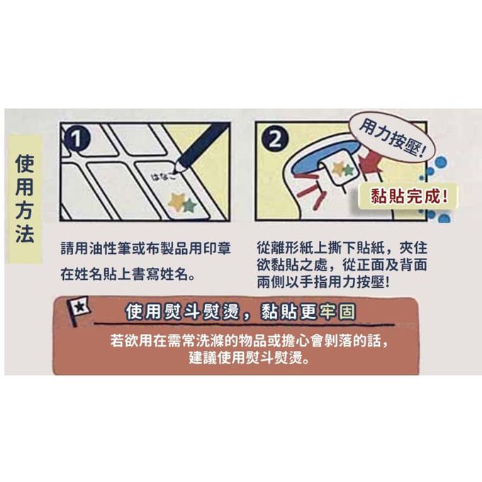 使用方式:①請用油性筆或布製品用印章在姓名貼上書寫姓名。②從離型紙上撕下貼紙,夾住欲黏貼之處,從正面及背面兩側用手指用力壓按。③若欲用在需常洗滌的物品或擔心會剝落的話,建議熨燙。請在已黏貼的貼紙上方墊一塊布,用中溫(140~180℃)乾熨燙。④將熨斗往下重壓約15秒左右。待完全冷卻後移開墊布。●絲質・尼龍・亞克力纖維・聚胺基甲酸酯・聚酯纖維等只能使用低溫熨燙的布料不可使用熨燙方式黏貼。●熨燙時若熱度或力量不夠,洗滌時容易剝落。