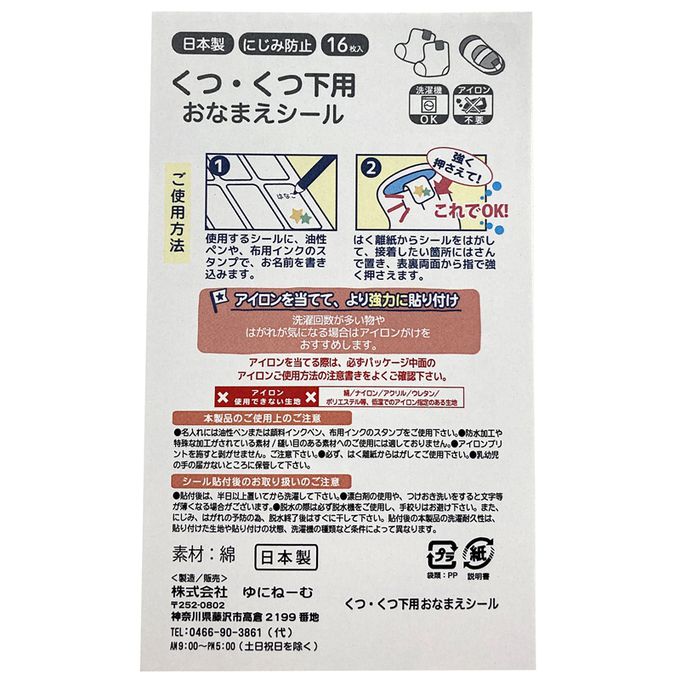 使用方式:①請用油性筆或布製品用印章在姓名貼上書寫姓名。②從離型紙上撕下貼紙,夾住欲黏貼之處,從正面及背面兩側用手指用力壓按。③若欲用在需常洗滌的物品或擔心會剝落的話,建議熨燙。請在已黏貼的貼紙上方墊一塊布,用中溫(140~180℃)乾熨燙。④將熨斗往下重壓約15秒左右。待完全冷卻後移開墊布。●絲質・尼龍・亞克力纖維・聚胺基甲酸酯・聚酯纖維等只能使用低溫熨燙的布料不可使用熨燙方式黏貼。●熨燙時若熱度或力量不夠,洗滌時容易剝落。