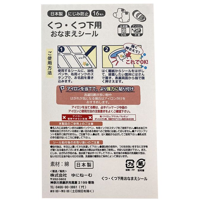 使用方式:①請用油性筆或布製品用印章在姓名貼上書寫姓名。②從離型紙上撕下貼紙,夾住欲黏貼之處,從正面及背面兩側用手指用力壓按。③若欲用在需常洗滌的物品或擔心會剝落的話,建議熨燙。請在已黏貼的貼紙上方墊一塊布,用中溫(140~180℃)乾熨燙。④將熨斗往下重壓約15秒左右。待完全冷卻後移開墊布。●絲質・尼龍・亞克力纖維・聚胺基甲酸酯・聚酯纖維等只能使用低溫熨燙的布料不可使用熨燙方式黏貼。●熨燙時若熱度或力量不夠,洗滌時容易剝落。